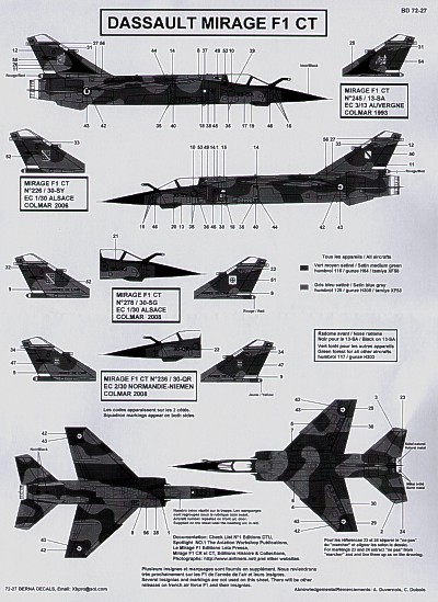 Berna Decals - 1/72 Re-printed!!! Dassault-Mirage F.1CT 4 No 245/13-SA Ec 3/13 Auvergne 1993, No 226/30-SY EC1/30 Alsace 2006, No 278/30-SG EC1/30 Alsace 2008, No 236/30-QR EC2/30 Normandie-Niemen 2008. Data etc. for one aircraft.