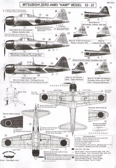 Berna Decals - 1/72 Mitsubishi 'Zero' A6M3 Model 22-32: 2 Kokutai (Q-102) 1942, Kiyoshi (X-151) 1942, 582 Kokutai (188) 07/04/1943, 204 Kokutai (T2-190) 1943, 1 Kokutai (Z-162) 1942, Iwakumi Kokutai (TII-138) 1943, 261 Kokutai (159) 1943, Okumura (WI-108) 1943, Nishizawa (UI-106) 1943