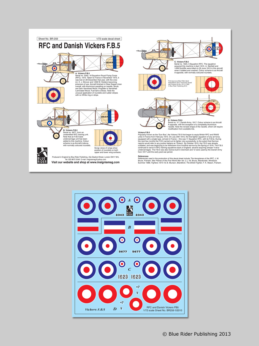 Blue Rider - 1/72 Vickers F.B.5 4 2343 18 Sqn Rfc France 1915, 5677 Rfc Training Unit, 1623 5 Sqn RFC, No V.7 Danish Army 1917.