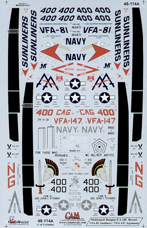 Cam Decals - 1/48 McDonnell-Douglas F/A-18C (2) 163708 NG/400 VFA-147 Argonauts Cag Uss John.C.Stennis 2002, 163471 AA/400 VFA-81 Sunliners Cag Uss George Washington 2002