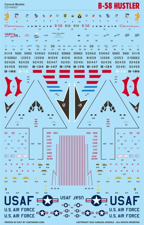 A scaled-down version of our best-selling 1/48 and 1/72 scale products, this decal sheet is designed to fit the Academy 1/144 scale B-58 Hustler kit.