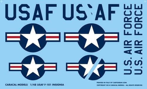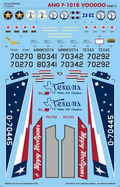 Caracal Models - 1/48 Air National Guard McDonnell F-101B Voodoo Part 2: This follow-on to our first F-101B sheet (long sold out) features F-101B markings from North Dakota, Minnesota and Texas Air National Guard units. Some of the most striking markings ever worn by the Voodoo.