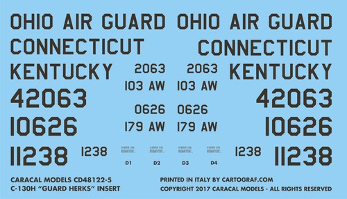 Caracal Models - 1/48 USAF Lockheed C-130H Hercules Guard Herks This very comprehensive 1/48 scale decal set features accurate markings for the hard-working C-130H fleet operated by the US Air National Guard.