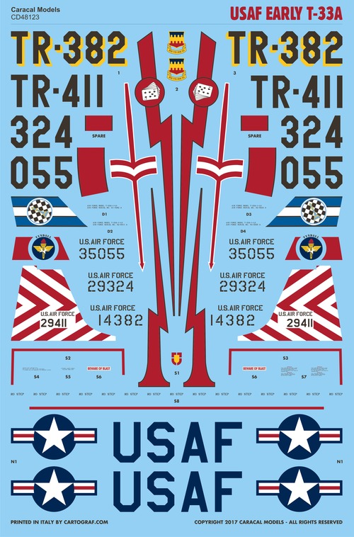 We designed this 1/48 scale T-33 sheet in response to your requests for an early USAF T-33A sheet to go with the initial release of the Great Wall Hobby kit, which depicts an early T-33 airframe. All of the options on this set date from the 1950s - complete with Lockheed style buzz numbers, and the colorful markings that characterize this era. The options on this sheet are: