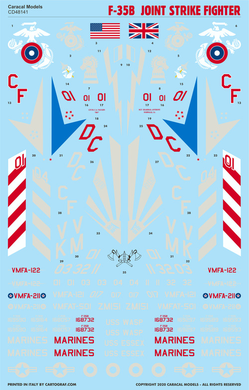 Caracal Models - 1/48 Lockheed-Martin F-35B Joint Strike Fighter Marking options for all F-35B Lightning II operators all Usmc units flying the type, Raf and Italy. Designed for the Kitty Hawk kit.