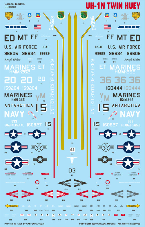 Caracal Models - 1/48 Bell UH-1N Twin Huey. The reliable and versatile UH-1N has been a workhorse of many militaries in this 1/48 scale sheet, we present a variety of markings from USAF, US Navy and US Marine Corps intended for the Kitty Hawk kit.