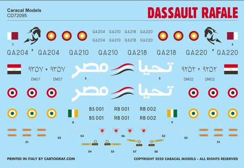 Caracal Models - 1/72 Dassault Rafale export decals. One of the most advanced fighter designs from Europe, the Dassault Rafale had proven itself in combat over Libya, Mali, and most recently Syria. Our new decal sheet for the 1/72 scale Italeri kit features markings for both single-seat (Rafale E) and twin-seat (Rafale D) examples from all foreign operators of this attractive jet.