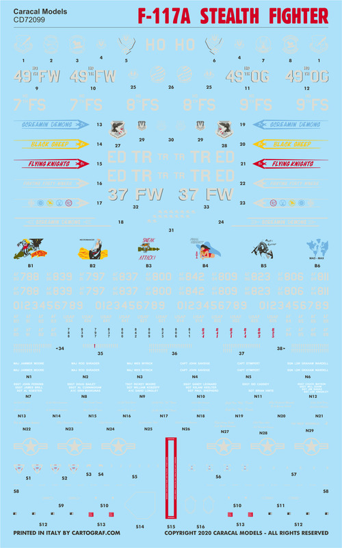 This 1/72 scale sheet for the F-117A features a comprehensive selection of options covering the entire service history of this important aircraft. In addition to examples attached to every operating unit in Holloman during the 2000s, we provide markings for 6 aircraft that flew in Desert Storm, each with unique bomb bay artwork and accurate crew names. Markings for Vega 31, the only F-117 to be lost in action, are also included.