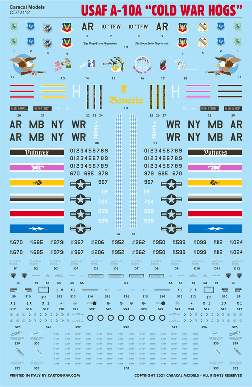 This very comprehensive decal set provides markings for A-10A Thunderbolts in the European One camouflage scheme that the type wore during the height of the Cold War and the first Gulf War that followed.