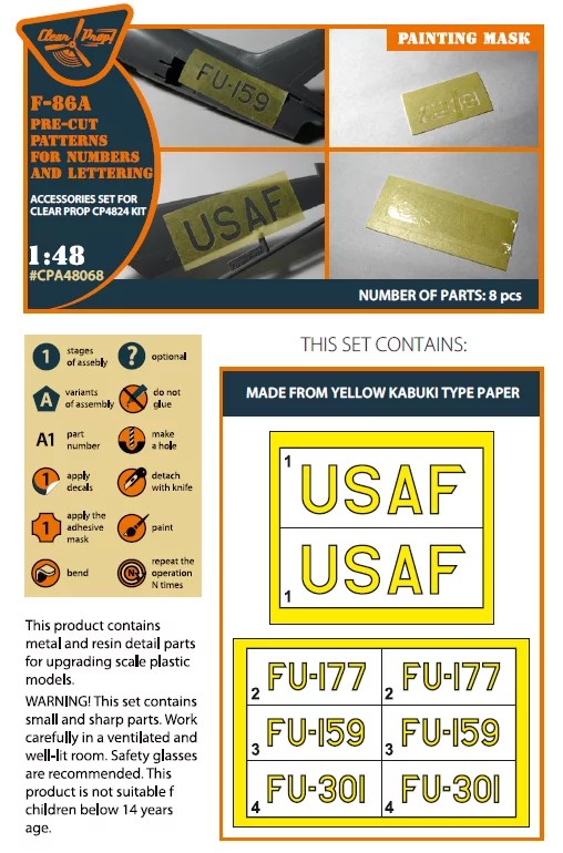 Clear Prop - 1/48 North-American F-86A Sabre pre-cut patterns for numbers and lettering painting mask USAF and code letters on 'yellow kabuki paper' for CP4824 kit (for Clear Prop)