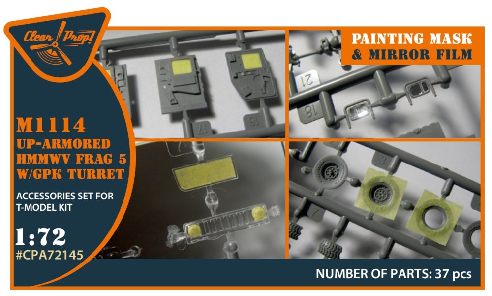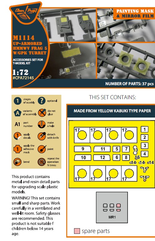 Clear Prop - 1/72 M1114 Up-armored Hmmwv Frag 5 W/GPK Turren painting mask on 'yellow kabuki paper' for T-Model kit