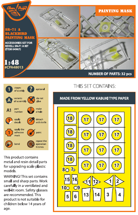 Clear Prop - 1/48 Lockheed SR-71A Blackbird painting mask on yellow kabuki paper (for Revell kits)