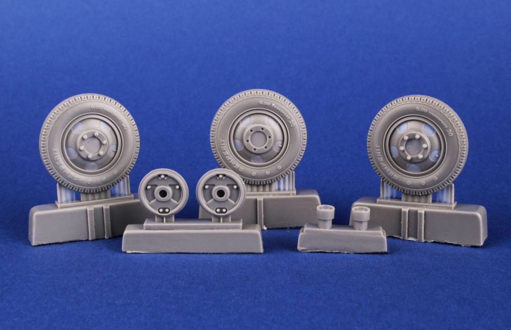 Detailed cast wheels for the front axle of the V3000S/SSM Maultier half-track vehicle kit by ICM. This kit is also reboxed by Revell. (for Icm and Revell kits)