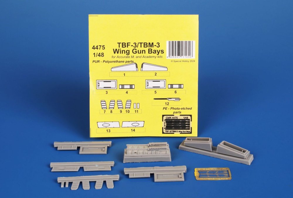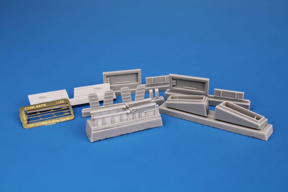 CMK - 1/48 Grumman TBF-3/TBM-3 Wing Gun Bays (for Academy, Accurate Miniatures and Italeri kits) Open wing gun bays with machine guns and ammo boxes, for both wings of Accurate Miniature's TBF-3/TBM-3 Avenger kit. The set makes is a straightforward improvement of that quite popular model kit also reboxed by Italeri and Academy.