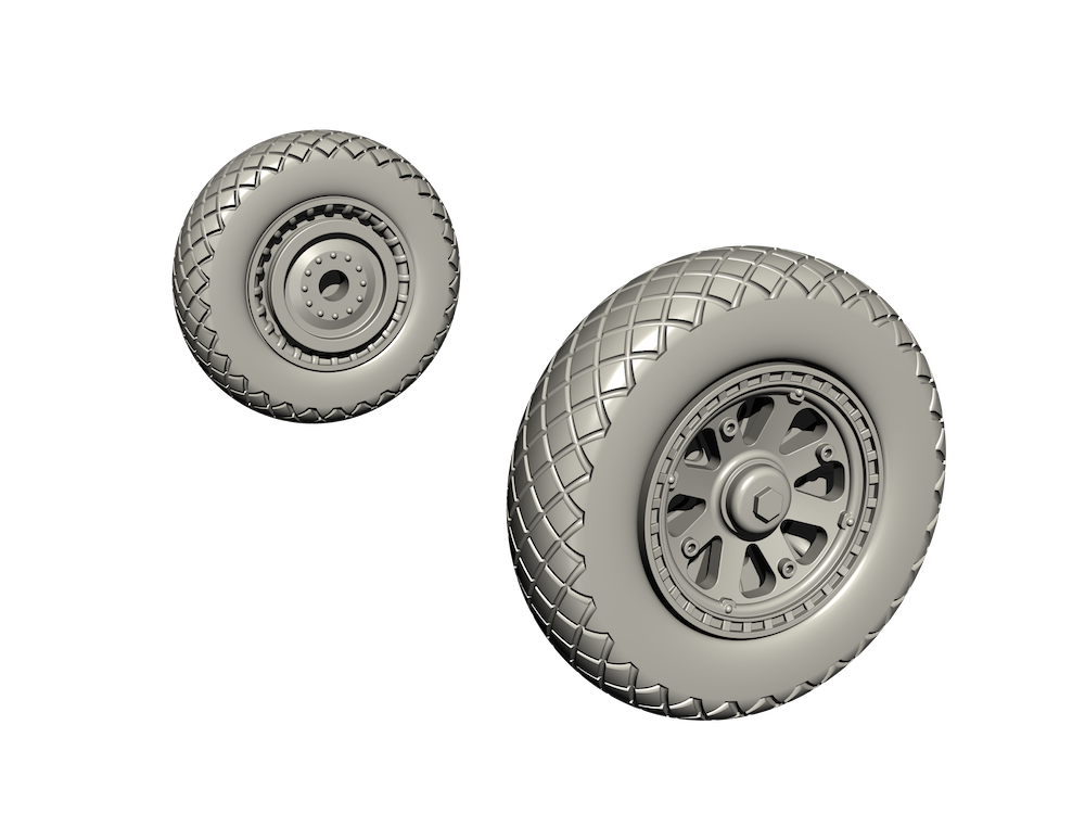 CMK - 1/72 Curtiss SB2C-3/SB2C-4 Helldiver - 1/72 Mainwheels (for Academy, Airfix and Cyber Hobby kits) The set offers new main undercarriage wheels with nicely detailed tread pattern and brake drums. To show the internal details and allow the hub covers to come with real-like openings, the covers are designed as separate parts. 3D designed and the master produced in 3D printer.