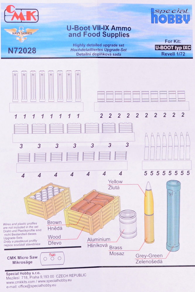 CMK - 1/72 Type VIII/IXC Ammo and Food Supplies, for Revell kits) During the war, German submarines often stayed at sea for very long time and supplies of food and ammunition had to be taken aboard in large quantity, either when the submarine was in the port or even at sea from other supply ships or even supply submarines.Now, we are bringing these food and ammo crates in the form of a nicely detailed resin set, which can be used with other models too. (U-Boot/U-Boat/U Boat/U Boot/Submarines]