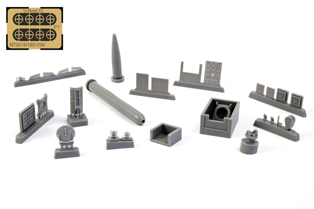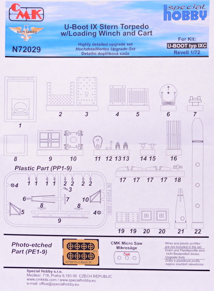 CMK - 1/72 Type VIII/IXC Stern Torpedo with loading winch and cart (for Revell kits) Yet another of the world s best resin cast sets tailored for German submarine models. This set is made for the U-Boot Type IX and enables the modeller to open the deck hatch which was used for loading rear torpedos into the submarine using an onboard winch. The master patterns were 3D designed, large parts are cast from resin and tiny parts which could not be produced by the means of resin casting are injection moulded into metal type moulds. (U-Boot/U-Boat/U Boat/U Boot/Submarines]