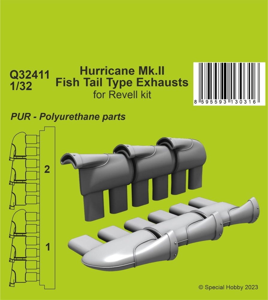 CMK - Hawker Hurricane Mk.II Fish Tail Type Exhausts 1/32 / (for Revell kits) New fishtail type exhausts with fine details, a lot better than the kit styrene items. Designed to fit the new Revell's Hurricane model. (for Revell kits)