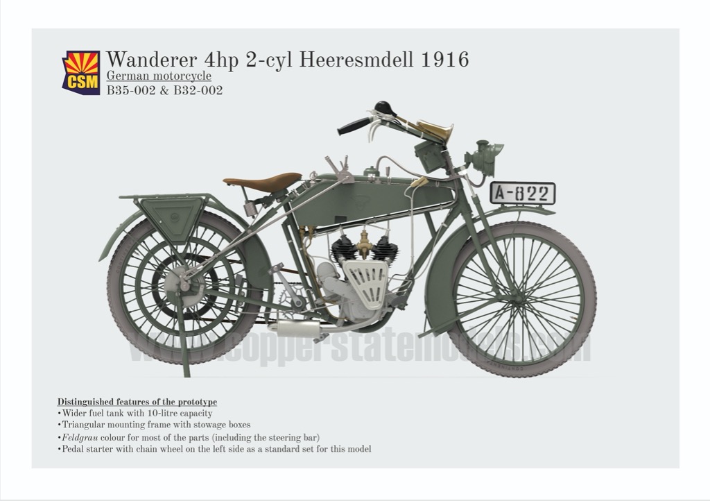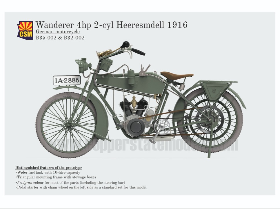 Copper State Models - 1/35 Wanderer 4PS 1916 Heeresmdell Motorcycle. 3D-Printed Wanderer motor cycles were manufactured in the German town of Chemnitz between 1902 and 1929.
