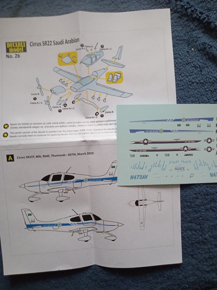 Decarli Model - 1/72 Cirrus Sr 22 with markings for Saudi Arabian Air Force, USAF, Alaska Airlines cadets. Includes an acetate cabin. The model has both wheels and aerodynamic covers