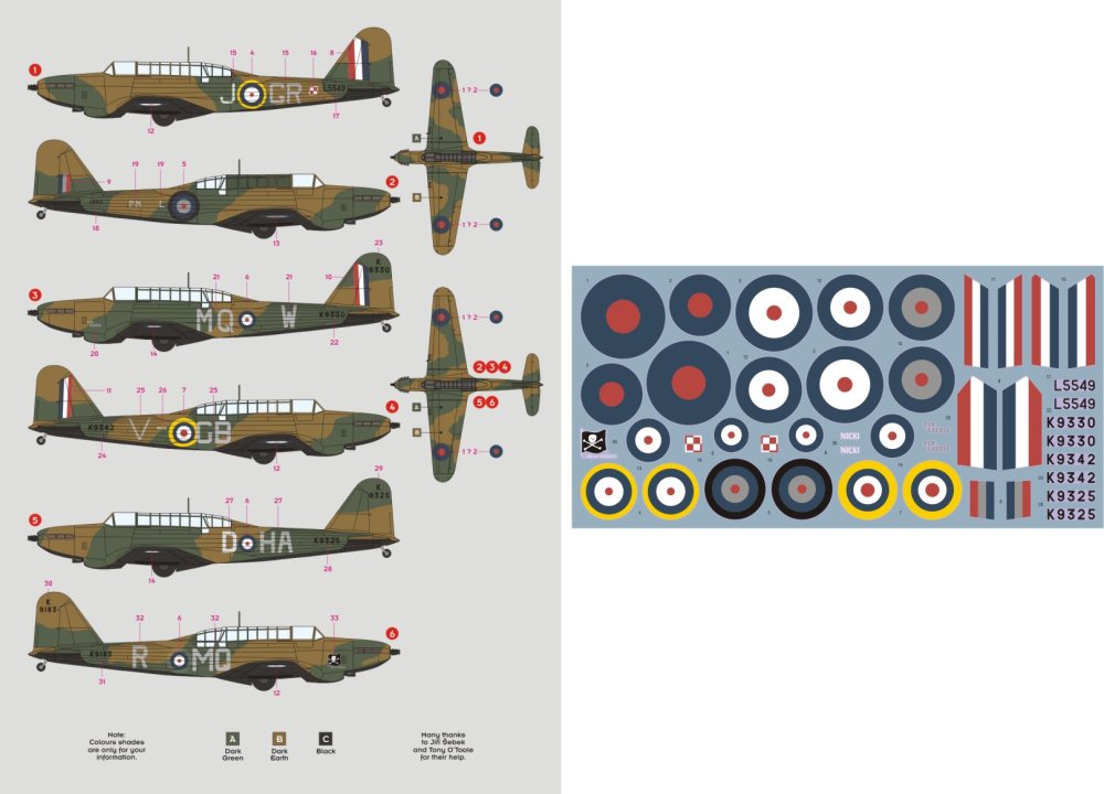 DK Decals - 1/48 Fairey Battle Mk.I1. Battle Mk.I L5549, No.301 Sq. RAF2. Battle Mk.I L5513, No.103 Sq. RAF3. Battle Mk.I K9330, No.226 Sq. RAF4. Battle Mk.I K9342, No.105 Sq. RAF5. Battle Mk.I K9325, No.218 Sq. RAF6. Battle Mk.I K9183, No.226 Sq. Raf