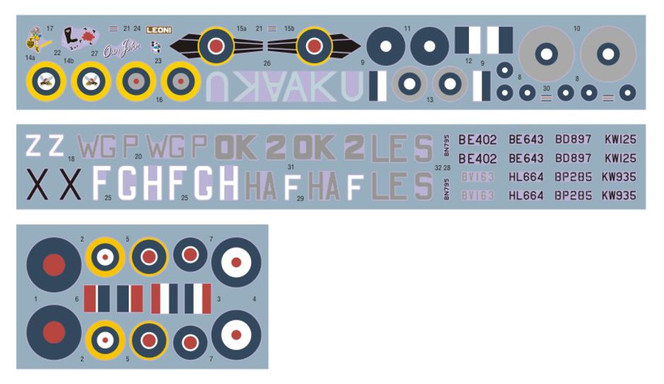 DK Decals - 1/72 Hawker Hurricane Mk.II over the Far East, Malta and Africa1. Hurricane Mk.IIC, KW125, No.11 Sq. RAF, F/Sgt. R.H. Gibson, Burma 19442. Hurricane Mk.IIC, KW935, No.11 Sq. RAF, Burma 19443. Hurricane Mk.IIB, BD897, No.128 Sq. RAF, S/L B. Drake, Sierra Leone 19414. Hurricane Mk.IIB, BP285, No.335 Sq. RAF, North Africa 19435. Hurricane Mk.IIC, BE643, No.213 Sq. RAF, F/L D. Honor, Egypt 19426. Hurricane Mk.IIC, HL664, No.73 Sq. RAF, North Africa 19427. Hurricane Mk.IID, BN795, No.6 Sq. RAF, North Africa 19428. Hurricane Mk.IIA, BV163, No.126 Sq. RAF, F/Sgt. G. Tweedale, Malta 19429. Hurricane Mk.IIB, Z3574, personal aircraft of Air Vice Marshal K.R. Park, Malta 194210. Hurricane Mk.IIC, BE402, No.242 Sq. RAF, Malta 1941