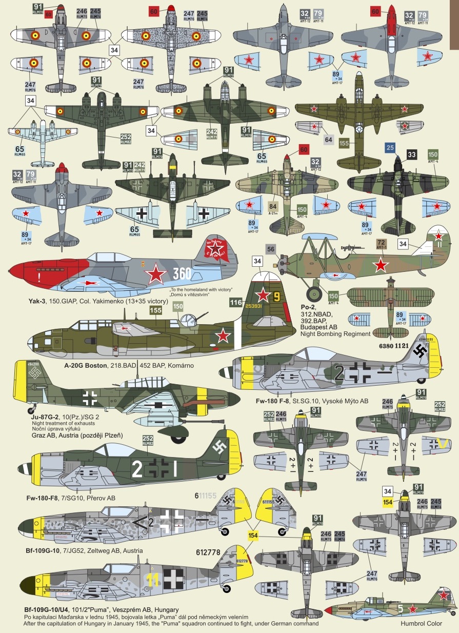 Messerschmitt Bf-109G, Junkers Ju-88, Ju-87D-5 Stuka, IAR-81, Henschel Hs-129B, Ilyushin Il-2, Il2m3, Lavochkin La-5FN, Yakovlev Yak-9T, Yak-3, Douglas A-20G Boston, Polikafrpov Po-2, Focke-Wulf Fw-190F-8
