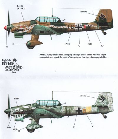 Eagle Cal - 1/32 Junkers Ju-87B-2 'Stuka' (2) T6+AN, 5./St.G. 2 Sept 1941 with Snake along fuselage, Yellow G Unit Unknown Winter 1941/1942 with MOuth,