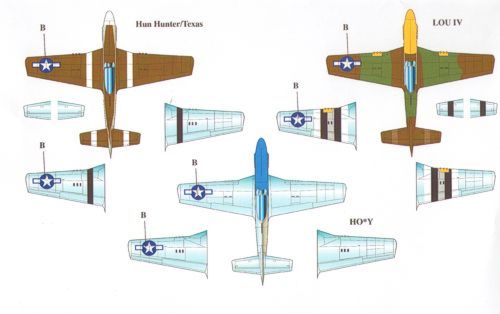 Eagle Cal - 1/48 North-American P-51D Mustang Part 2 (3) 44-13305 WR-Z 355th FG Capt Henry Brown "Hun Hunter/Texas", non standard OD on upper surfaces, white nose, partial D-Day stripes, 44-13410 E2-C 361st FG Col. Thomas J.Christian "Loi IV/Athelene" non standard OD/Dk Green uppersurfaces, yellow nose, partial D-Day stripes, 44-13878 HO-Y 352nd FG Maj. John Bennett, Sharkmouth, Blue nose
