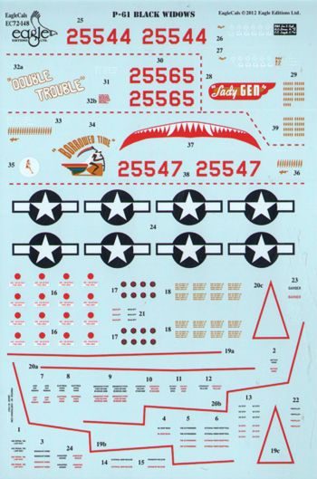 Eagle Cal - 1/72 Northrop P-61A Black Widow. "Borrowed Time" - P-61A-5-NO - 42-5547 "Double Trouble" - P-61A-10-NO - 42-5565 "Lady Gen" - P-61A-5-NO - 42-5544