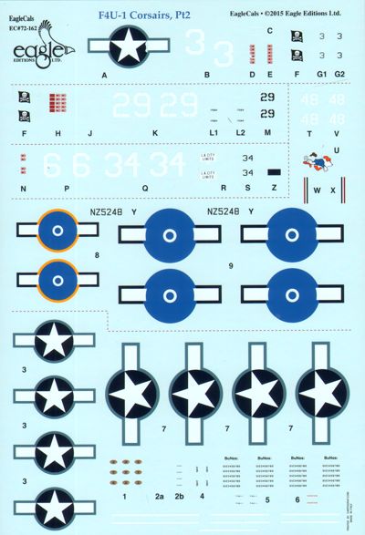 Eagle Cal - 1/72 Vought F4U-1 Corsairs White 29 BuNo 17684 VF-17 Jan 31 1944 Pilot: Lt.(jg) Ira "Ike" Kepford. This is the second aircraft flown by the 16 victory ace, but the first to be numbered ". White 3 BuNo Unknown VF-17 Feb 1944 Pilot: Lt.(jg) James "Big Jim" Streig. He flew two tours with VF-17 and is credited with 5.5 confirmed victories. L.A. City Limits BuNo Unknown VF-17 Mar 1944 Pilot: Lt.(jg) Doris C. "Chico" Freeman. He would claim two victories with VF-17 and an additional seven with VF-84. NZ5248 BuNo 56455 No. 21 Squadron RNZAF May 1945 Pilot unknown. This is one of at least three Corsairs marked with the "Enraged duck", it saw service with a number of different RNZAF squadrons.