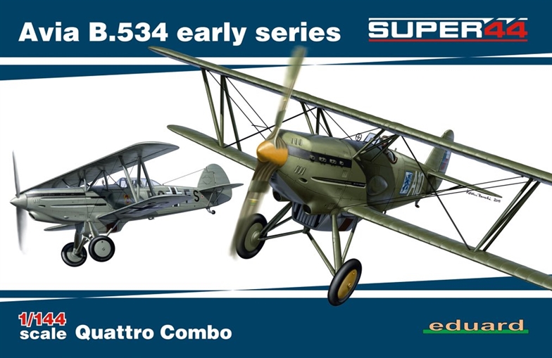 Eduard - 1/144 Avia B-534 early series QUATTRO COMBO Very first release of 1/144 scale kit from Eduard tool made in 2015, plastic parts for 4 complete models, decals printed by Eduard, 6 marking options. Painting mask, full color instructions.