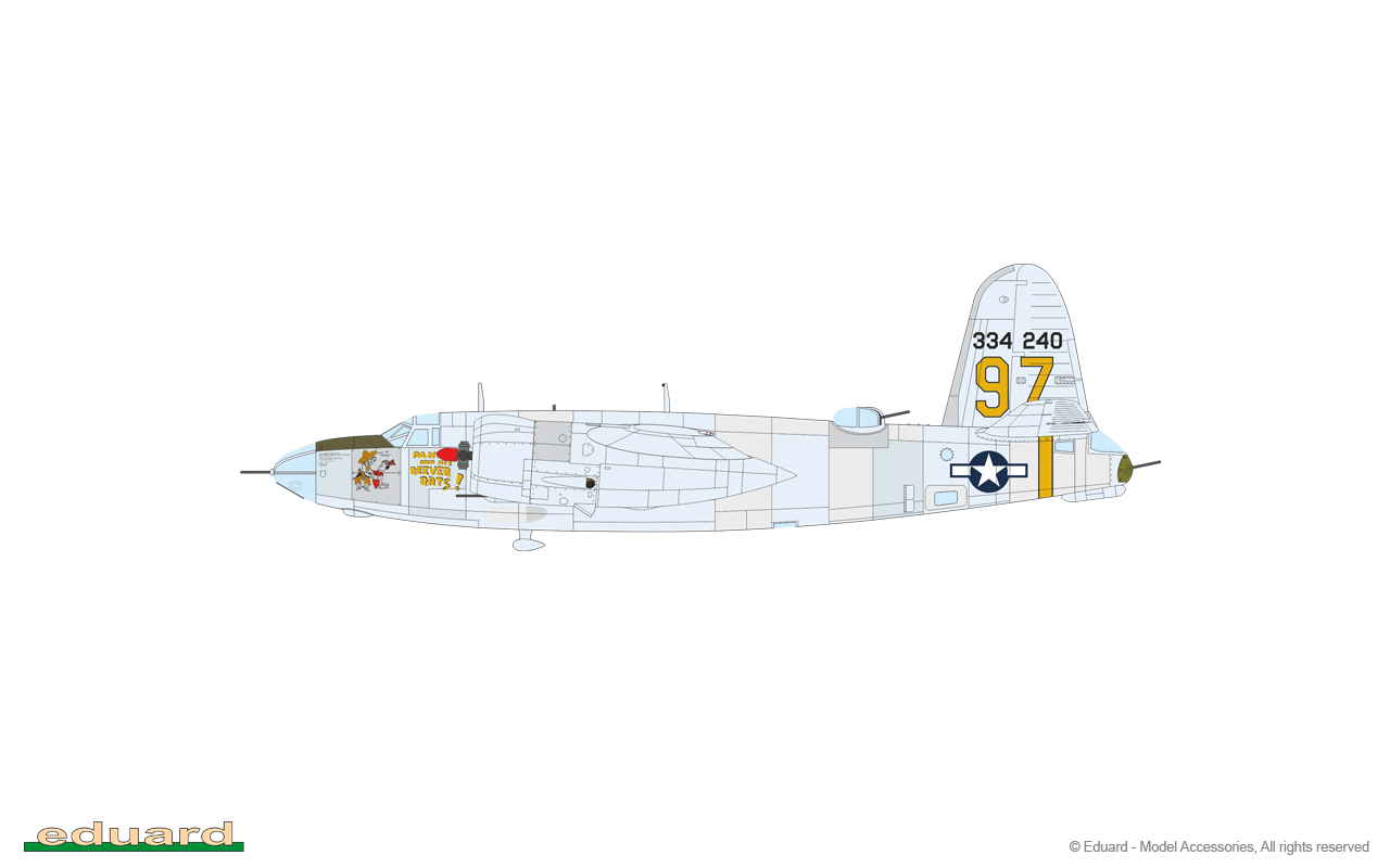 Eduard - 1/72 Martin Marauder Limited edition kit of WWII US medium bomber aircraft B-26F/G in 1/72 scale. In the box are machines from the MTO, Eto and PTO. plastic parts: Hasegawa- marking options: 8- decals: Eduard- Pe parts: yes, pre-painted- painting mask: yes resin parts: yes, wheels