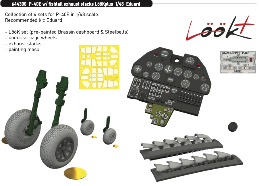 Eduard - 1/48 Curtiss P-40E Warhawk detail set with fishtail exhaust stacks, wheels, instrument panels, canopy mask LooKplus (for Eduard kits)