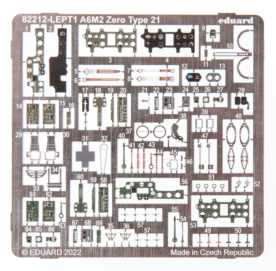 kit of Japanese WWII naval fighter plane A6M2 Zero Type 21 in 1/48 scale. Plastic parts: Eduard, marking options: 5, decals: Eduard, Pe parts: yes, pre-painted, painting mask: yes, resin parts: no