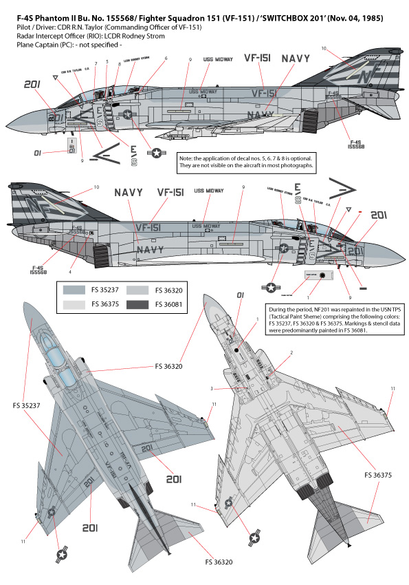 This product focuses on the last two Fleet (i.e., active duty) F-4S Phantom II fighter squadrons in the U.S. Navy, and includes decals for 3 aircraft in the low visibility Tactical Paint Scheme (TPS), and includes the aircraft that made the final catapult shot off the USS Midway by a F-4S Phantom II.