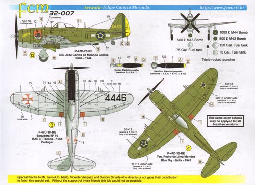 FCM - 1/32 Republic P-47D Thunderbolt Bubble tops. Brazil Air Force in Italy 1945. Aircraft numbers A2, A4, B1, B6, C1, C2, C3, C4, C5, D4 and D5 all olive drab/grey; 4446 Portuguese Air Force overall natural metal. This is an updated version of 32007 that was released many years ago.