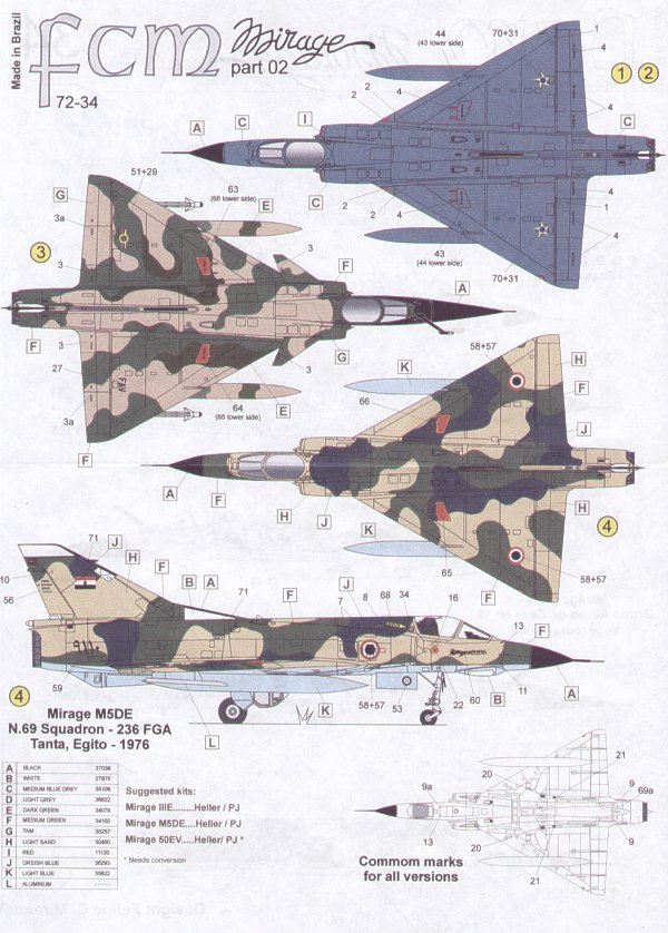 FCM - 1/72 Dassault Mirage III Part 2 (4) Dassault Mirage Iiie Br 29/AN 1st G.D.A Anapolis Brasil 1980 or 1985 Blue/Grey, Dassault Mirage 50EV Grupo Aereo de Caza 11, Venzuela 2992 FS34079/34102/30257, Dassault Mirage M5DE 69 Sqn 236 Fga Tanta, Egypt 1976 FS30400/34102/35622.
