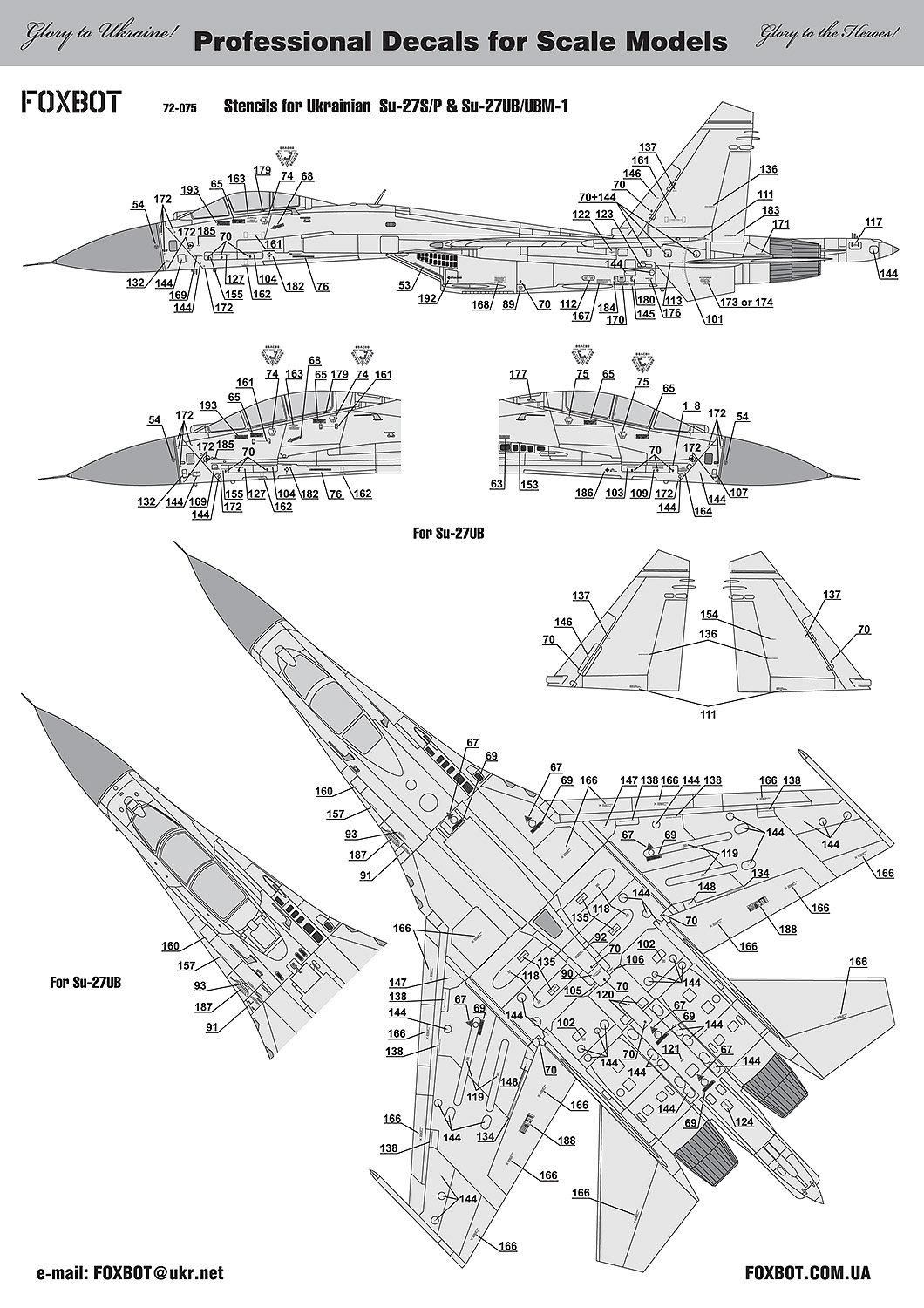 Foxbot Decals - 1/72 Stencils for Sukhoi Su-27S/P & Su-27UB/UBM-1 Ukrainian Air Forces for Airfix, Hasegawa, Heller, ICM, Trumpeter