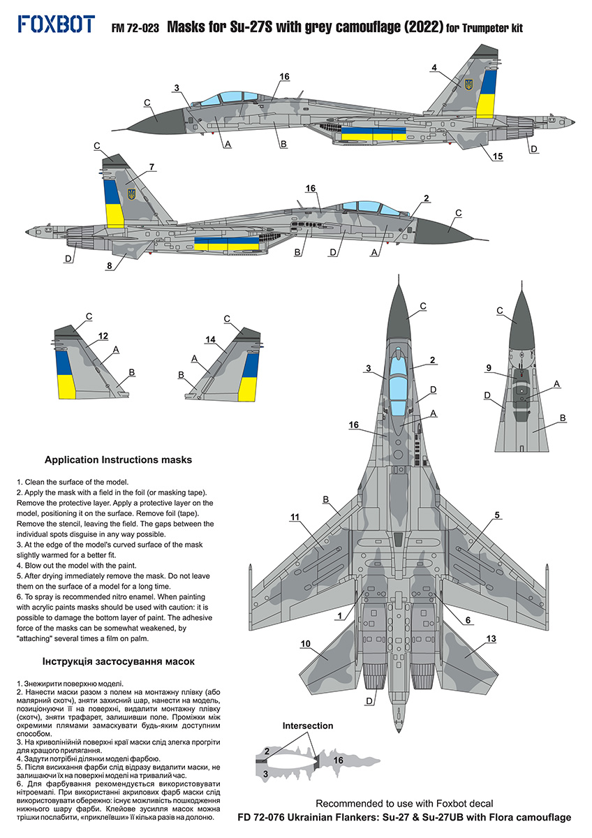 Foxbot Decals - 1/72 Masks for Sukhoi Su-27S, Ukrainian Air Forces, Grey camouflage for Ibg Models and Trumpeter