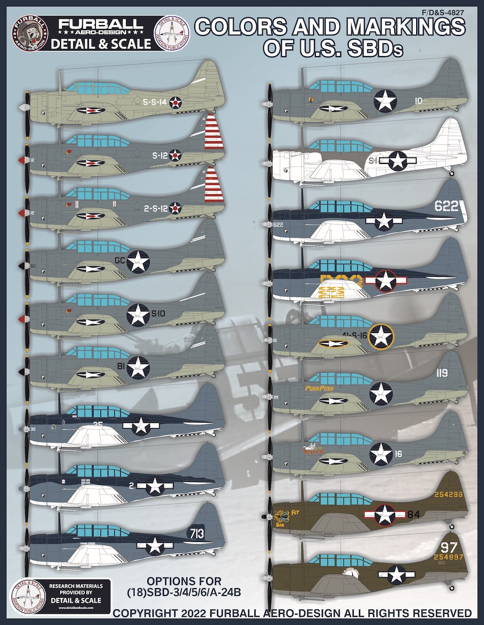 Furball Aero-Design - 1/48 'Colors & Markings of U.S. SBD's' continues our collaboration with out friends from Detail & Scale publications. This set has marking options for 18 SBD-3/4/5/6/A-24Bs. Enough stencils are included to build 2 complete models. Here are the aircraft covered in this set: