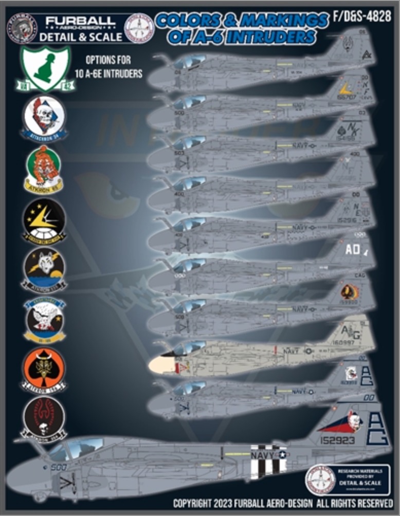 Furball Aero-Design - 1/48 'Colors and markings of Grumman A-6 Intruders' has options for ten A-6E Intruders and continues our collaboration with our friends from Detail & Scale.
