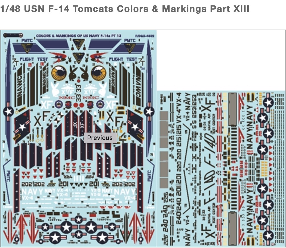 Furball Aero-Design - 1/48 'Colors & Markings of US Navy Tomcats Part 13' F/D&S-4832 continues our collaboration with our friends from Detail and Scale. This set has options for 14 F-14A/B/D test and evaluation Tomcats:-VX-4 F-14A 158978, XF-33, Nas Point MUGU, 1977-NMC F-14A 158614, NMC-215, Nas Point MUGU, 1973-VX-4 F-14A 161287, XF-46, Nas Point MUGU, 1985-VX-4 F-14A 161444, XF-47, Nas Point MUGU, 1984-VX-4 F-14A 159853, XF-1, Nas Point MUGU, 1990-NATC F-14A 158613, 7T-201, Nas Pax RIVER, 1982-NATC F-14A 158620, 7T-202, Nas Pax RIVER, 1982-PMTC F-14A 158623, PMTC-224, Nas Point MUGU, 1987-NAWC F-14A 158625, NAWC-226, Nas Point MUGU, 1987-NAWC F-14A 161623, NAWC-220, Nas Pax RIVER, 1993-VX-9 F-14B 161862, XF-240, Nas Point MUGU, 1999-WTS NF-14A 158625, WTS-226, Nas Point MUGU, 1997-PMTC F-14D 161867, PMTC-253, Nas Point MUGU, 1991-VX-4 F-14D 164604, XF-1, Nas Point MUGU, 1994Enough stencil and data are included to build two complete models