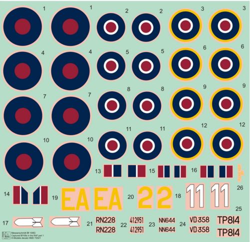 H-Model Decals - 1/72 Captured Messerschmitt Bf 109s in RAF, Pt.1 [Bf 109F-4 Bf 109G-2/Tropical Bf 109G-14 Bf 109G-6/U2