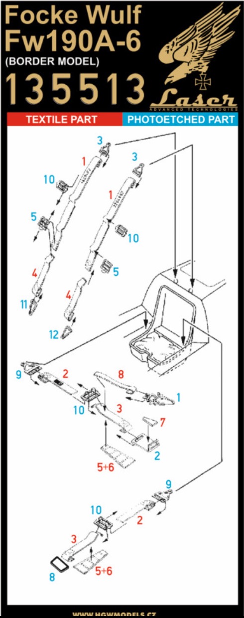 HGW - 1/35 Focke-Wulf Fw-190A-6 Seatbelts (for Border) Textile seat belts designed for aircraft Focke-Wulf Fw-190A-6 for Border Models kit. Belts are made from real microfibre and in combination with included photo etched buckles they look highly realistic. This product is available in 1/35 scale.