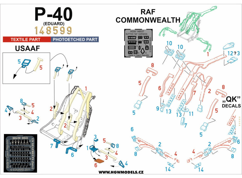 HGW - 1/48 Curtiss P-40E Warrhawk Seatbelts Harnesses designed for P-40 IIn 1/48 scale. Belts are made from microfibre material and in combination with included photo etched buckles they provide highly realistic look. (for Eduard and Hasegawa kits)