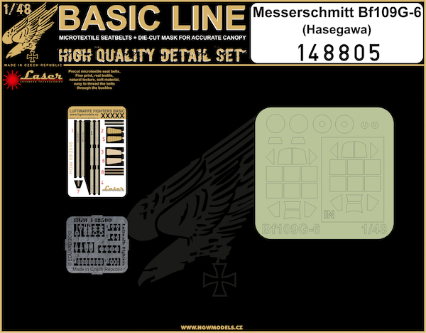 HGW - 1/48 Messerschmitt Bf 109G-6 BASIC LINE: microplastic seatbelts, etched buckles + canopy paint masks (for Hasegawa kits)