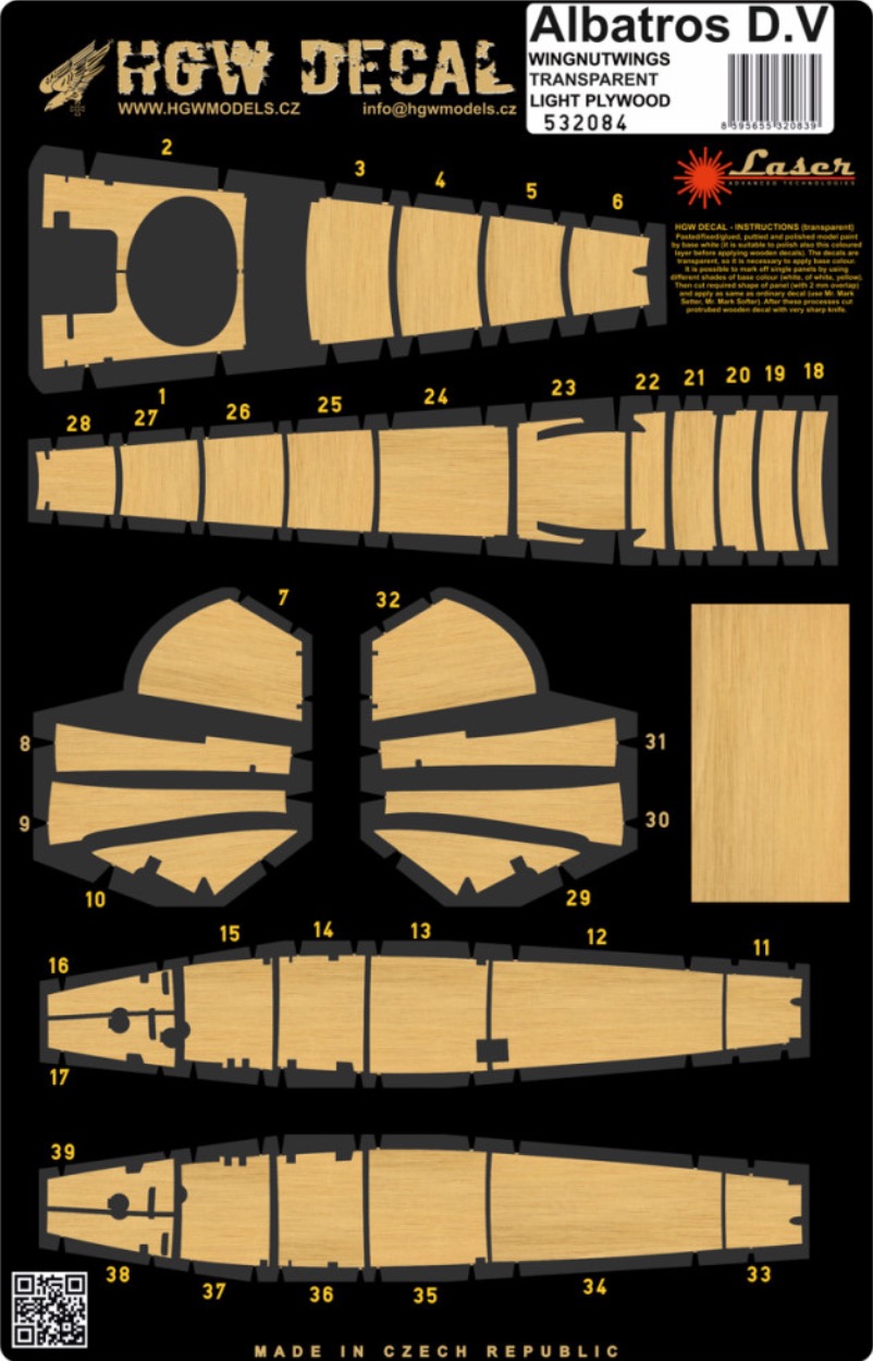 HGW - 1/32 Albatros D.V LASER-CUT Decal Decal set designed for model Albatros D.V in 1/32 scale from Wingnut Wings. This is plywood imitation. Decal is transparent so it is necessary to apply it on painted surface.