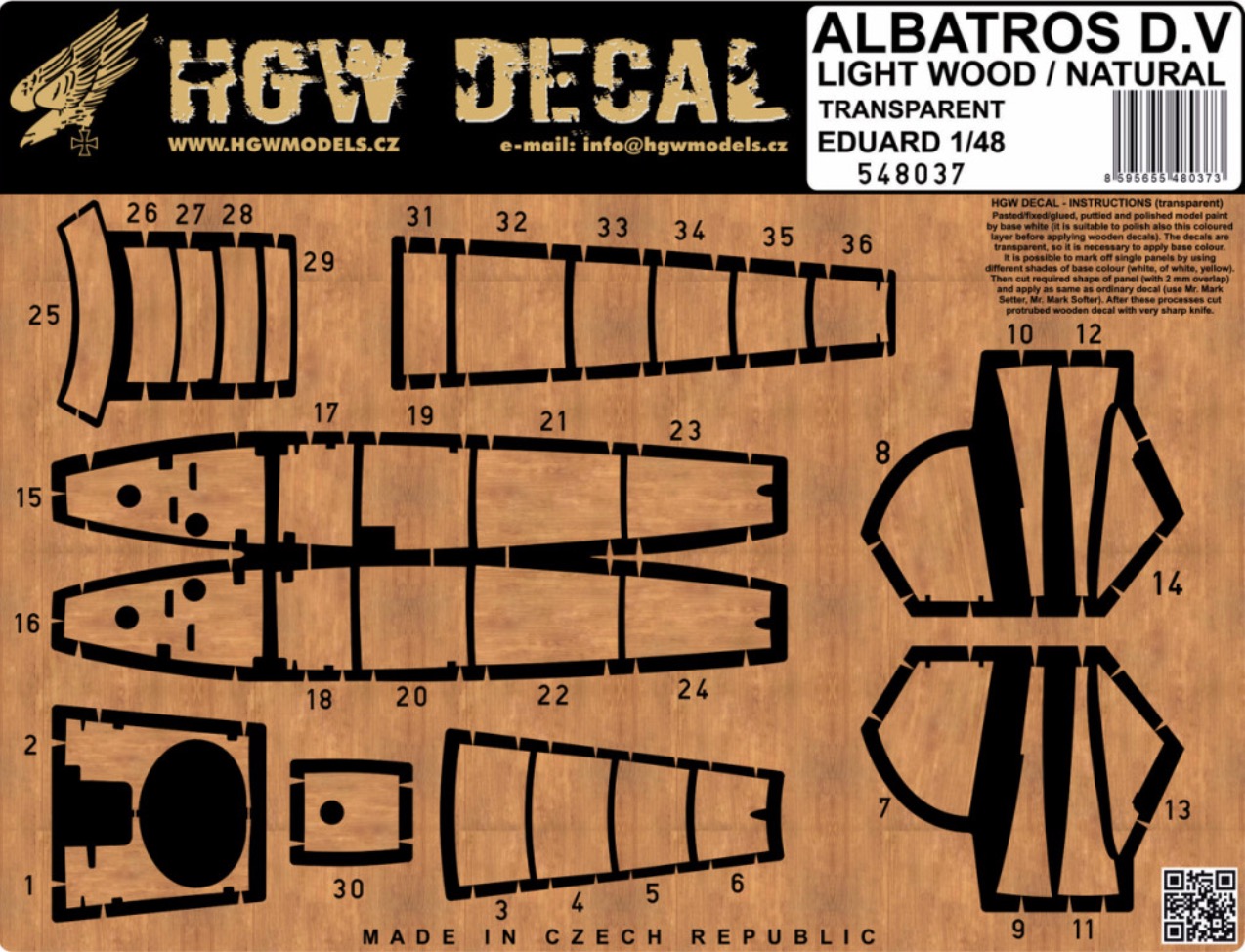 HGW - 1/48 Albatros D.V / D.VA LASER-CUT Decal . Decal set designed for model Albatros D.V / D.Va in 1/48 scale from Eduard. This is light wood natural imitation. Decal is transparent so it is necessary to apply it to painted surface.