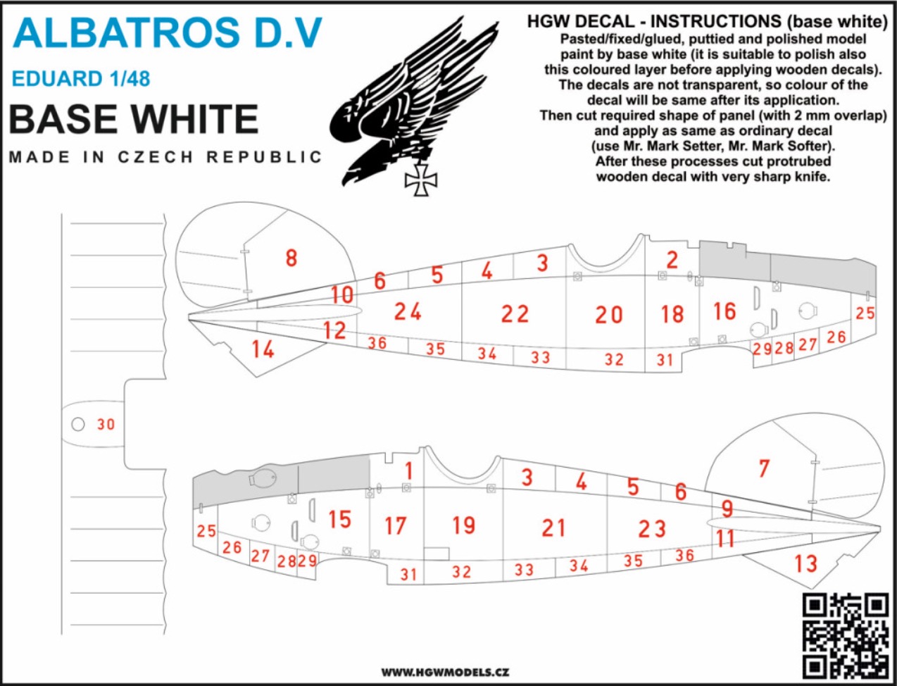 HGW - 1/48 Albatros D.V & D.VA LASER-CUT DECAL. Decal set designed for model Albatros D.V & D.Va in 1/48 scale from Eduard. This is light wood yellow imitation. Decal is base white so it is not necessary to apply it to painted surface.